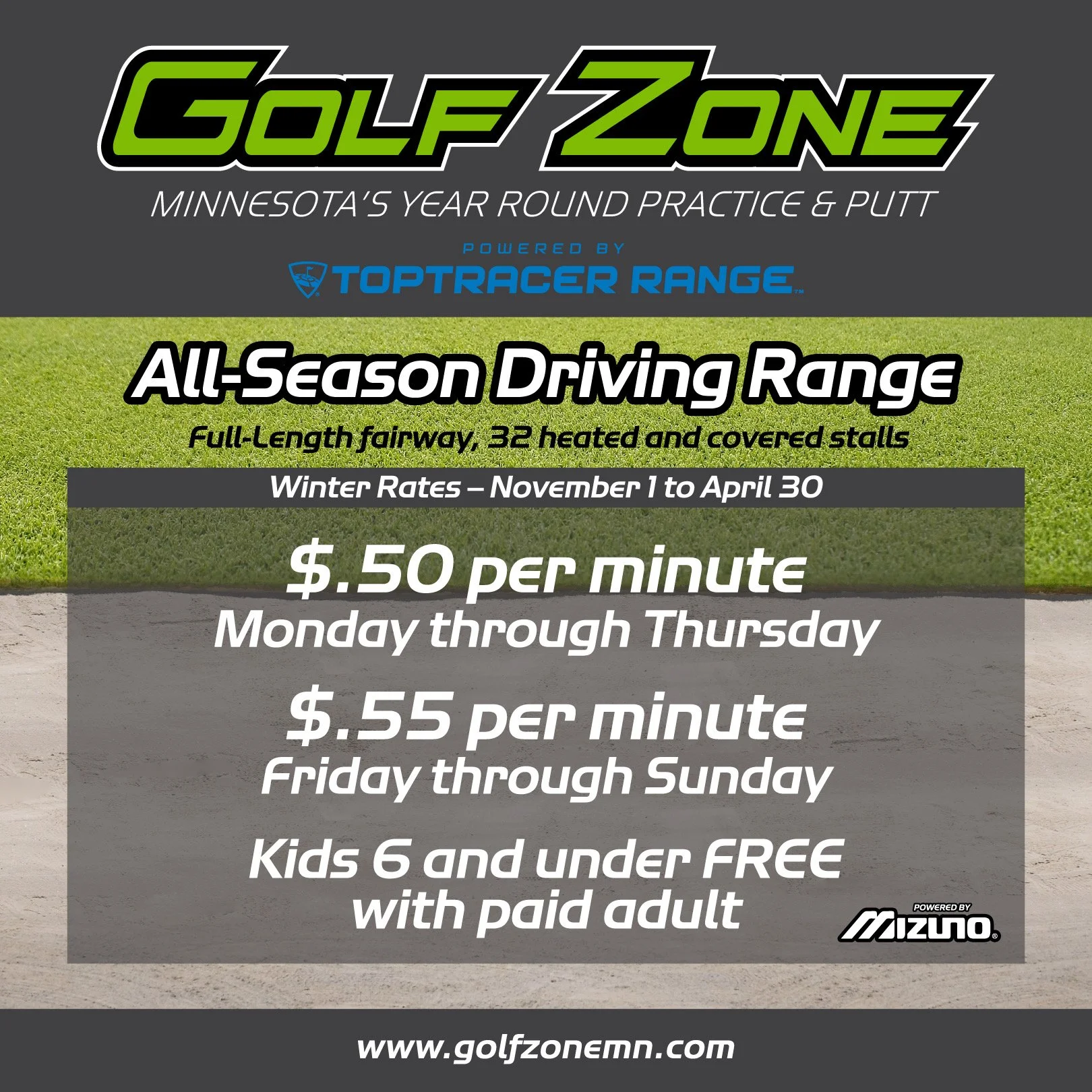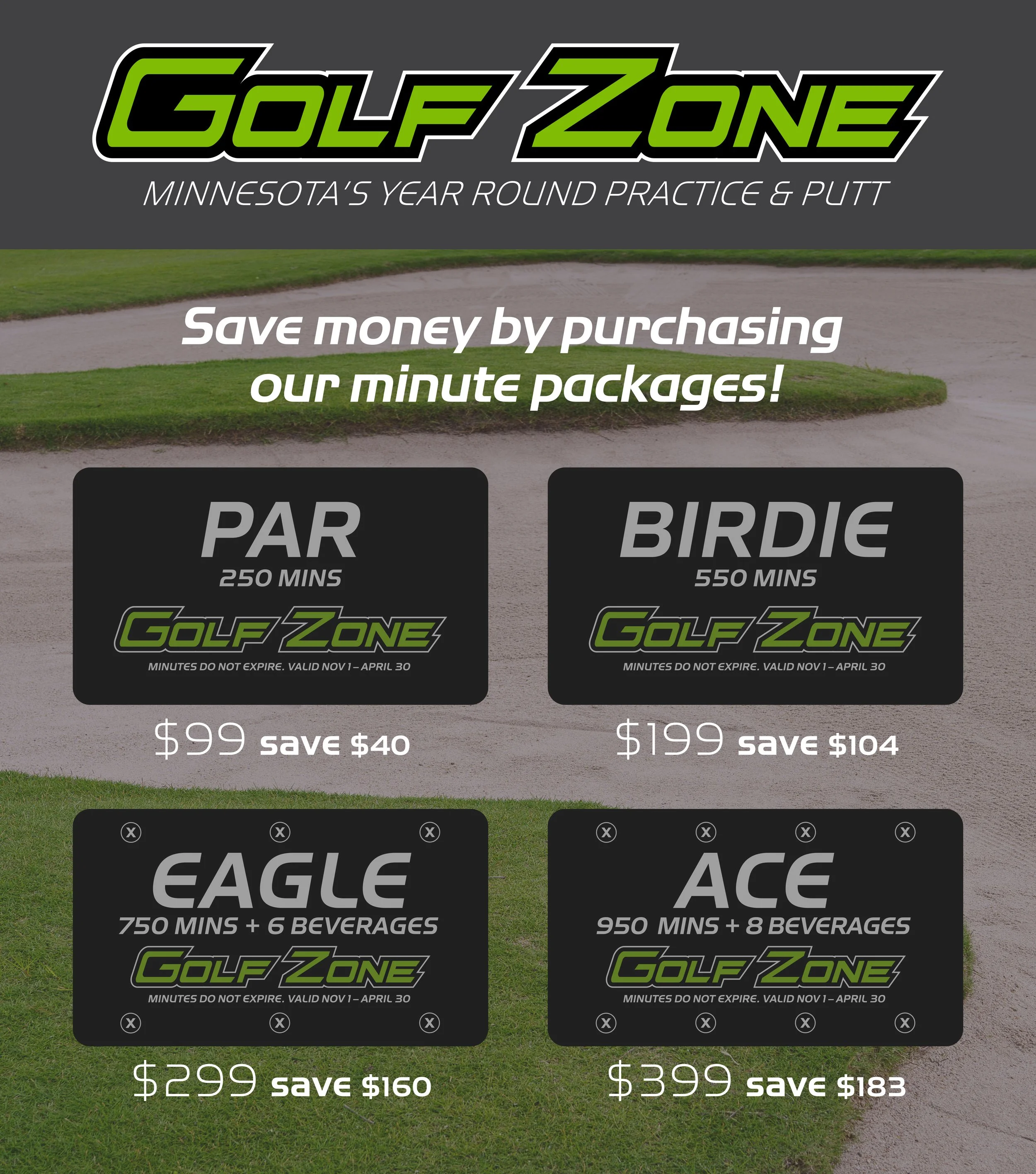 Golf Zone located in Chaska, Minnesota features a full-length heated driving range, a Northwoods themed 18-hole indoor mini putt course and the 19th Hole Bar.