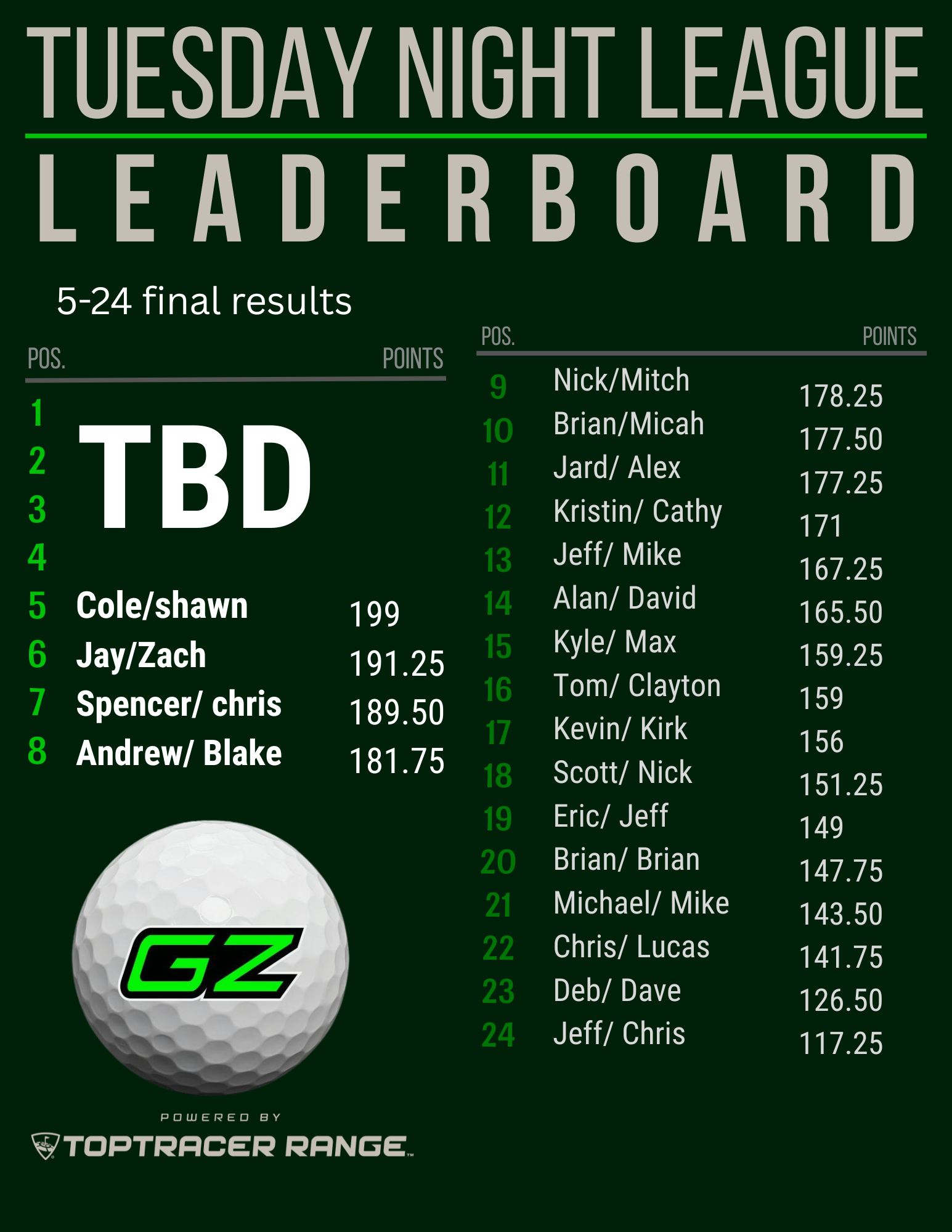 GZ League Handicaps will be updated weekly. A one-time League Fee will be due before the start of week one. Each week, every golfer will be required to pay for their range time. A single rate of $18.00 per golfer per night.
